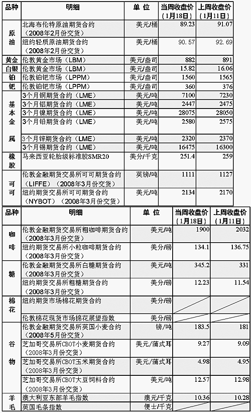 受美元疲軟以及美國經濟可能陷入衰退的影響,倫敦市場黃金價格14日創下每盎司914.30美元的歷史最高紀錄,白銀價格也達到每盎司16.60美元,為27年來最高。 分析人士指出,美元持續貶值和國際油價高位運行等因素,都增強了黃金作為避險保值工具的吸引力。貴重金屬咨詢公司GFMS表示,最近由于投資需求旺盛,金價屢破紀錄,金價在年內有可能升至每盎司1000美元。此外,由于美元疲軟和供給緊張,鉑價也再次刷新歷史最高紀錄,倫敦市場鉑價14日升至每盎司1592美元的歷史最高點。因投資者擔心美國經濟前景,基本金屬價格漲跌不一。 當周國際油價總體呈下滑之勢,美國一系列不景氣經濟數據的出臺以及前一周美國原油商業庫存意外大幅增加等是抑制當周油價的主要因素。 美國商務部15日公布的數據顯示,美國商品零售額去年12月份下降了0.4%,是過去6個月來的最大降幅。投資者擔心美國消費開支疲軟可能會導致美國經濟滑向衰退,國際市場原油需求將因此減少。國際能源機構16日也發表報告說,鑒于美國經濟可能陷入衰退,今年全球原油需求將增長2.3%,低于該機構此前的預測值。與此同時,美國能源部16日公布的油品庫存報告顯示,在截至1月11日的一周里,美國原油商業庫存比前一周增加430萬桶。此外,美國汽油和其他成品油庫存也分別出現上升。 但在當周最后一個交易日(18日),美國總統布什發表講話要求實施金額為1400億到1500億美元的減稅方案,以刺激經濟增長和避免經濟陷入衰退。部分投資者認為美國政府的減稅計劃可能見效,因此國際油價在連續下挫之后出現反彈。 其它大宗商品方面,在咖啡價格升高后受交易者獲利退出的影響下,本周咖啡價格下跌。汽油替代品——乙醇生物燃料的需求旺盛推升了糖價。