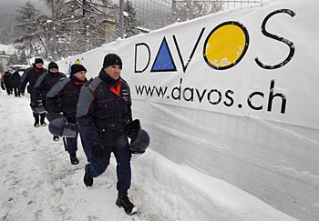 | 在瑞士達(dá)沃斯的世界經(jīng)濟(jì)論壇年會(huì)會(huì)場,一隊(duì)警察在雪中巡邏。本報(bào)資料照片 | 聚焦全球經(jīng)濟(jì)