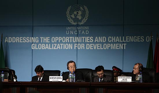 | 20日,聯(lián)合國秘書長潘基文(中)出席在加納首都阿克拉舉行的第12屆聯(lián)合國貿(mào)易和發(fā)展大會開幕式。新華社/法新 |