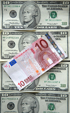 圖為歐元(上)和美元紙幣。新華社/法新 | 近一年來,美國經濟深受次貸危機等問題困擾,加上美國聯邦儲備委員會連續降息,美元匯率持續下跌。但從今年7月中旬開始,美元匯率明顯反彈,歐元兌美元比價已從最高點1比1.6以上跌至目前的1比1.5以下。 8月22日紐約外匯市場尾市時,歐元兌美元比價為1比1.4775,低于前一個交易日的1比1.4877。