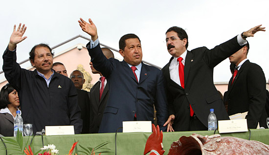 25日,在洪都拉斯首都特古西加爾巴自由廣場,洪都拉斯總統(tǒng)塞拉亞(右)、委內(nèi)瑞拉總統(tǒng)查韋斯(中)和尼加拉瓜總統(tǒng)奧爾特向人群揮手致意。洪都拉斯總統(tǒng)塞拉亞當(dāng)日簽署決議書,宣布洪都拉斯正式加入“美洲玻利瓦爾替代計劃”。