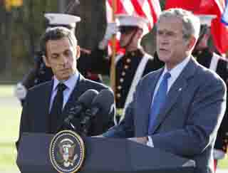 18日,美國總統布什(右)在馬里蘭州戴維營發表講話。當天,布什在會見到訪的法國總統薩科齊和歐盟委員會主席巴羅佐時宣布,美國將于近期就國際金融危機問題主持召開一次國際峰會。新華社/法新