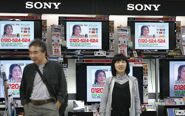 29日,在日本東京一家電器行,兩名顧客站在電視機前。受金融危機及全球經濟減速的影響,數碼產品市場的需求量降低,日本幾大數碼產品制造商今年第三季度利潤大幅縮水。索尼公司當日發布的財報顯示,今年第三季度公司營業利潤比去年同期下降90%。新華社/路透