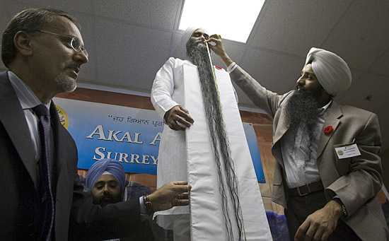 11日,在加拿大不列顛哥倫比亞省薩里,人們測量瑟爾萬·辛格(中)的胡須的長度。經測量,辛格的胡須長為1.895米,他準備沖擊吉尼斯世界紀錄。新華社/路透