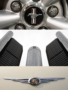 | 圖為拼版照片,顯示了2006年10月14日在美國邁阿密拍攝的2007年款福特野馬汽車的標志(上),2006年7月12日拍攝的位于美國底特律的通用汽車總部(中)和2007年5月14日在美國邁阿密拍攝的克萊斯勒汽車的標志。新華社/法新 | 經過馬拉松式的艱苦談判,美國國會民主黨議員與白宮官員9日晚就總額150億美元的汽車業救援方案達成原則一致,美國汽車業因而將成為近來繼金融業之后第二個得到政府救助的行業。 該協議最快可望在10日送交國會表決。但據參與談判的官員透露,由于一些共和黨議員仍對一些具體條款持有異議,該原則能否在國會通過還存在變數。