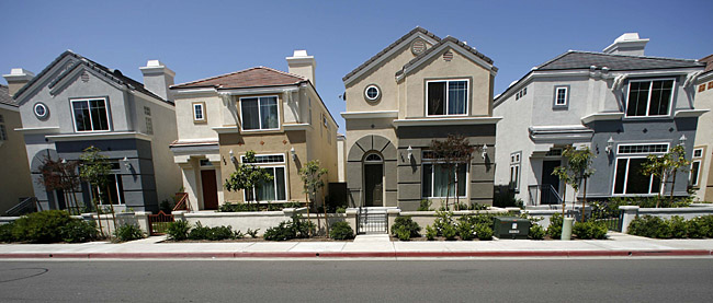 | 美國住房評估網(wǎng)站Zillow.com今年8月份發(fā)布報(bào)告說,在最近5年內(nèi)購買房產(chǎn)的美國人中,大約1/3購房者的抵押貸款負(fù)債已超過其房產(chǎn)價(jià)值。在加利福尼亞州的4個(gè)主要城市,90%的房主負(fù)債超過房產(chǎn)價(jià)值。這是在美國加州埃斯孔迪多拍攝的“買一贈(zèng)一”的房屋,這些房屋每套價(jià)值40萬美元。新華社/路透 |