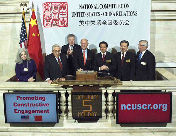 5日,在美國紐約證券交易所,美中關系全國委員會會長歐倫斯(左四)、中國常駐聯合國代表張業遂(右三)、美國前國務卿基辛格(左二)等參加慶祝中美建交30周年紀念儀式。