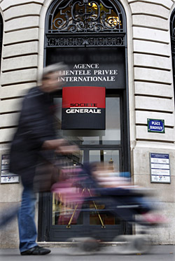 | 一名路人從巴黎法國興業(yè)銀行一家分行門前走過。新華社/路透 | 歐洲聯(lián)盟多數(shù)成員國去年相繼實施規(guī)模不同的救市計劃,但收效甚微。面對金融企業(yè)股票價格過去一周的大幅跳水,比利時、德國和法國等國21日相繼宣布,正在醞釀第二輪救市,以挽救投資者對金融領(lǐng)域乃至整體經(jīng)濟的信心。