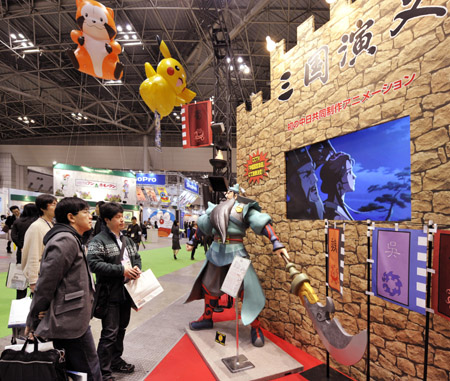 18日,在日本首都東京舉行的國際動漫展上,人們觀看由中國和日本聯合制作的52集高清動畫片《三國演義》。本屆國際動漫展將持續4天,來自日本和其它國家和地區的大約250家公司在這里展示他們最新的動漫作品,預計前來參加的觀眾將達到13000人。