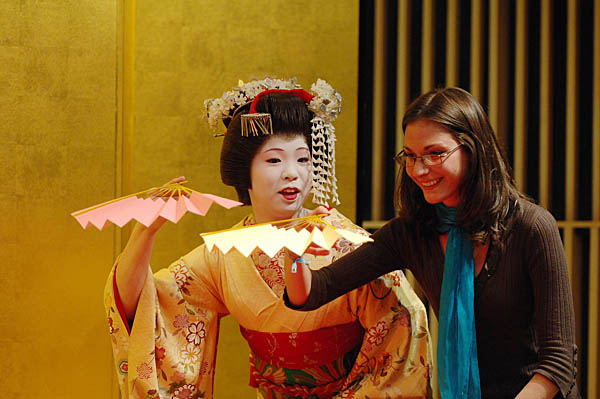 21日,一名外國游客在東京與藝妓進行一項傳統日本游戲。日本政府日前提出要在2020年前后將赴日外國游客增至2千萬的目標,其中傳統藝術和獨特的飲食文化將是宣傳重點。