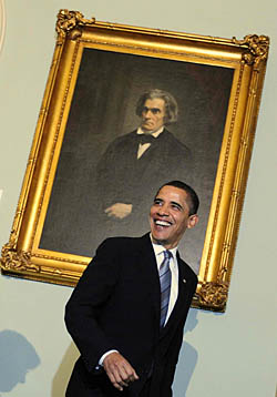 | 25日,美國總統奧巴馬抵達華盛頓國會山,準備與參議院討論2009財政年度預算案。新華社記者 張巖