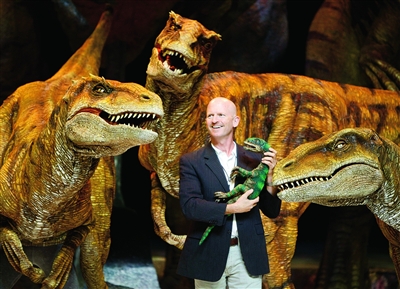 5日,在英國倫敦,藝術導演斯科特·法里斯站在恐龍模型中間。這個由法里斯導演的“與恐龍為伴”主題演出以15頭按照真實大小制作的機械恐龍再現了遠古時期的恐龍生存狀況,將持續到8月31日。新華社/路透