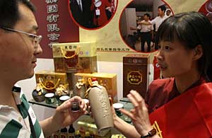 | 6月6日首屆山西品牌節在太原舉行,當日,有141件自主商標參展,其中馳名商標14件,山西省著名商標127件。工作人員(右)在向參觀者介紹山西千年老陳醋品牌。新華社發