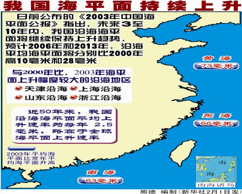 國家海洋局發展戰略研究所高級工程師鄭淑英告訴記者,近50年來,我國沿海海平面以每年2.5毫米的速率上升,高于全球海平面上升速率的40%。 “2006年,我國沿海海平面比常年平均海平面高71毫米,預計2016年,我國沿海海平面將比2006年上升31毫米。”鄭淑英說,海平面上升將直接引發風暴潮災發生的頻率增大,災害強度加大,同時加重海水倒灌、海岸侵蝕等災害影響,直接導致沿岸陸地被淹、海島面積縮小。