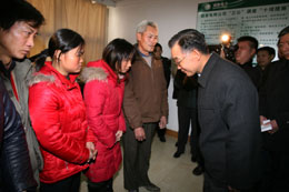 1月29日,溫家寶總理在湖南長沙看望在沙坪變電站除冰搶險中不幸殉職的周景華、羅長明、羅海文3名電力職工的家屬。溫家寶說:“今天面對你們,我無法用更多的語言來表示安慰,我給你們鞠個躬吧!”新華社記者:姚大偉 攝