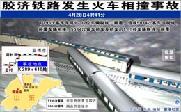 28日凌晨4時48分,北京至青島的T195次下行到膠濟線周村至王村區間時,客車尾部第9節至第17節車廂脫軌,與上行的煙臺至徐州的5034次旅客列車相撞,致使機車和五節車廂脫軌,造成重大人員傷亡。到晚間發稿時為止,已死亡70人,傷416人。其中有4名法國旅客受傷。 記者在現場看到,從北京至青島的T195次列車有8節車廂傾覆到鐵路一旁。與其發生碰撞的5034次從煙臺至徐州的火車,至少有4節車廂脫軌。 淄博中心醫院副主任醫師徐東譚14時在現場接受記者采訪時說,他從早6時就來到現場,負責將傷員分派到各家醫院。已有110多名傷員經他的手被分派往多家醫院救治。他說,傷員多是面部受傷、受撞擊骨折等。 據初步調查顯示,這是一起人為責任事故。鐵道部已作出決定,免除濟南鐵路局黨政主要負責人的職務,接受審查,聽候處理。 據了解,膠濟線周村至王村區間限速為每小時80公里。北京至青島的T195次下行通過時達到每小時131公里。事故詳細原因正在調查中。