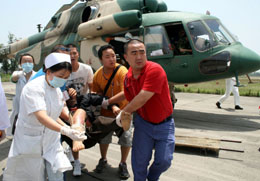 5月18日,醫(yī)務人員和志愿者從直升機上接下傷員。當日中午,首批來自重災區(qū)北川縣的20名重傷員被某陸航團4架直升機運送到彭山縣,然后轉運至眉山市的主要醫(yī)療機構進行救治。北川縣邊遠鄉(xiāng)鎮(zhèn)的重傷員將陸續(xù)被送往眉山救治。新華社發(fā)(姚永亮攝)