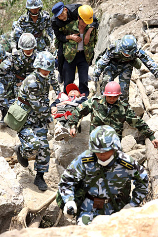 | 5月18日,海軍陸戰隊官兵在轉移受災群眾。地震發生后,有400多名群眾在轉移途中被困在大山深處的清平鄉高橋路段,缺水斷糧。18日清晨6時,由海軍陸戰隊兩棲偵察隊50名骨干隊員組成的救援突擊隊,徒步十多公里的塌方山路,排除千難萬險,攀越多處塌方路段,采取分組接力的方法,火速轉移群眾。截至發稿時,救援突擊隊將綿竹天池鄉和清平鄉83名因地震被困6天的群眾成功營救到安全地帶。新華社記者