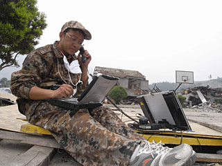 | 5月17日,記者李柯勇在汶川映秀小學廢墟間采訪。蔡國兆