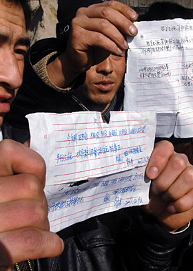 | 近年來,企業(yè)職工收入分配“強資本、弱勞工”的狀態(tài)十分突出,因而民工欠薪問題屢屢出現(xiàn)。圖為幾位農(nóng)民工正在出示他們的欠款“白條”。新華社記者