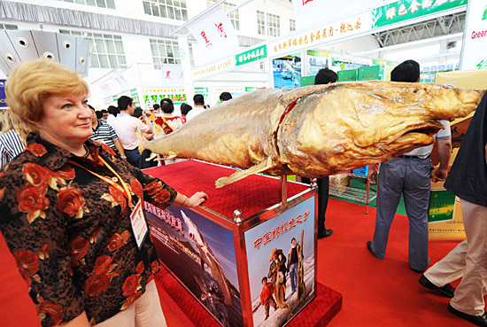 6月15日,一位客商在鱘鰉魚標(biāo)本旁留影。 當(dāng)日,第19屆中國(guó)哈爾濱國(guó)際經(jīng)濟(jì)貿(mào)易洽談會(huì)展會(huì)部分在哈爾濱國(guó)際會(huì)展中心開展。本屆哈洽會(huì)共設(shè)2400個(gè)國(guó)際標(biāo)準(zhǔn)展位,有俄羅斯、日本、美國(guó)等59個(gè)國(guó)家和地區(qū)的11800多名客商參會(huì)參展。 | |