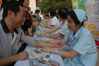 圖為江北區社區服務機構工作人員為轄區居民免費體檢。