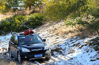 | 一名自駕車旅游者在秋雪過后的克什克騰草原上拍攝。新華社記者 張領