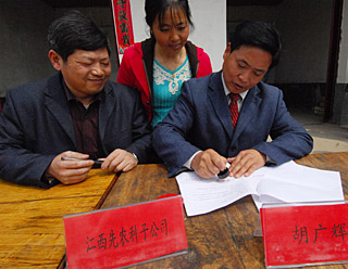 | 2008年3月20日,農戶胡廣輝(右)與江西先農種子公司、中糧米業等6家單位簽下合同書,使自己的糧食生產從播種到收獲加工再到銷售等各個環節得到相應保障。胡廣輝承包水田9000畝,年產稻谷550萬公斤,在2007年獲得“全國糧食生產大戶”榮譽稱號。 |
