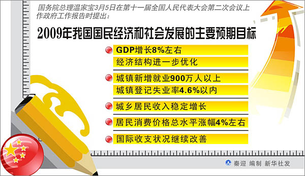 政府工作報(bào)告提出2009年中國經(jīng)濟(jì)增長預(yù)期目標(biāo)為8%左右。這也是中國政府連續(xù)五年將經(jīng)濟(jì)增速目標(biāo)設(shè)定為這一數(shù)字。但今年這一目標(biāo),卻格外不尋常。 在國際金融危機(jī)尚未見底,世界各大權(quán)威機(jī)構(gòu)對全球經(jīng)濟(jì)增長預(yù)測悲觀,主要經(jīng)濟(jì)體將會出現(xiàn)負(fù)增長的背景下,人們十分關(guān)心中國經(jīng)濟(jì)能否順利達(dá)到這一目標(biāo)。 “經(jīng)濟(jì)增長的周期性調(diào)整與國際金融危機(jī)影響相疊加,導(dǎo)致我國經(jīng)濟(jì)下行壓力加大。8%左右,是一個(gè)要通過努力才能實(shí)現(xiàn)的目標(biāo)!比珖舜蟠、東北財(cái)經(jīng)大學(xué)校長艾洪德說,“只有這樣才能創(chuàng)造必需的就業(yè)機(jī)會,才能實(shí)現(xiàn)經(jīng)濟(jì)社會的良性運(yùn)轉(zhuǎn)! 2008年第四季度中國經(jīng)濟(jì)增速下滑到了6.8%,中國經(jīng)濟(jì)面臨嚴(yán)峻考驗(yàn)。不過,憑借中國經(jīng)濟(jì)堅(jiān)實(shí)的發(fā)展基礎(chǔ)、廣闊的內(nèi)需市場、穩(wěn)健的金融體系、有力的宏觀調(diào)控舉措,接受記者采訪的代表、委員都對中國經(jīng)濟(jì)發(fā)展有著堅(jiān)定的信心。 全國人大代表、中國人民銀行濟(jì)南分行行長楊子強(qiáng)相信:“中國經(jīng)濟(jì)有望在本輪經(jīng)濟(jì)衰退中率先復(fù)蘇”。但他提醒說,當(dāng)前一些經(jīng)濟(jì)指標(biāo)有好轉(zhuǎn)跡象,但這并不足以表明經(jīng)濟(jì)觸底回暖!敖衲炅咴路輰且粋(gè)重要觀測窗口”。 全國政協(xié)委員、財(cái)政部財(cái)科所所長賈康預(yù)測,如果處理得好,中國經(jīng)濟(jì)增速今年會呈現(xiàn)前低后高走勢。但也要做好防范國際經(jīng)濟(jì)形勢進(jìn)一步惡化的預(yù)案。
