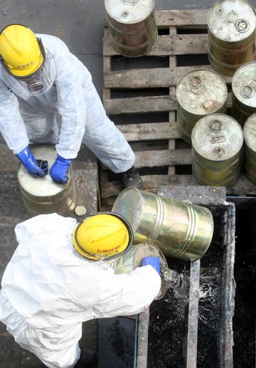 3月11日,身穿防化服的技術人員將易制毒化學品倒入回收容器。當天,天津市公安局緝毒處集中銷毀重量達8.7噸、價值百余萬元的易制毒化學品。銷毀工作先添加化學試劑,然后用高爐高溫處理,不會對環境造成污染。