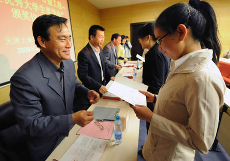 近日僑資企業益海嘉里與中國青少年發展基金會合作開展助學項目。從2004年至2008年五年間益海嘉里共捐贈5100萬元,其中,對天津大學累計捐助獎學金總額近50萬元。圖為在天津大學舉行的“希望工程——益海嘉里優秀大學生獎學金”頒獎儀式上,一名獲獎者上臺領獎。