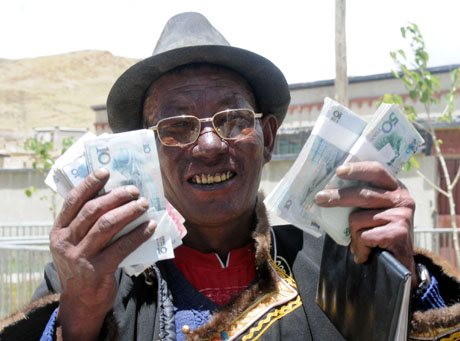 7月4日,西藏崗巴縣貢巴村牧民羅布領到8000多元政策性農業保險賠付款后開心不已。 2009年5月25日至27日,西藏崗巴縣遭遇了20多年來首次初夏降雨雪天氣,全縣9816頭牲畜因冰凍死亡。人保西藏分公司在災害發生后第一時間趕赴現場,并于7月4日將104萬元賠付款全部賠付到農牧民手中。西藏自2006年啟動政策性農業保險試點以來,目前已有30個縣納入試點范疇。