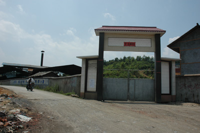 沒有掛任何牌子的湖南省武岡市精煉錳加工廠,大門上方的“招財進寶”四個大字格外醒目。 |