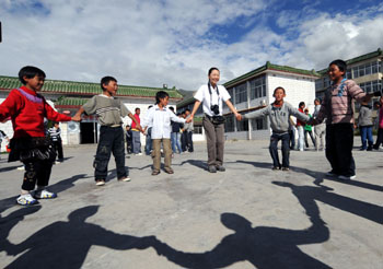 中華慈善總會兒童基金會的志愿者與拉薩兒童福利院的孩子們做游戲。新華社記者:覺果