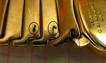 2年后,賀先生突然發現,表帶和表殼上出現針尖大小的黑點,經過專業手表維修店清洗后,黑點沒有消失。此后,賀先生目睹黑點逐漸擴大成一塊塊黑斑。北京一位手表專業維修人員告訴賀先生:“真正的18K包金表殼、表帶戴在手上是不會生銹腐爛的。”