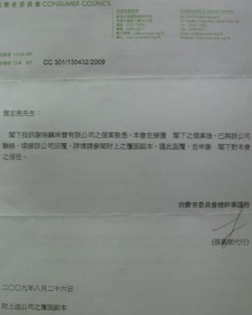 2009年9月10日,賀先生收到了香港消費者委員會轉達的謝瑞麟珠寶公司就此事給該會的正式書面復函,復函內容為——“本公司已將客人的投訴內容向供應商反映,經供應商了解后表示: