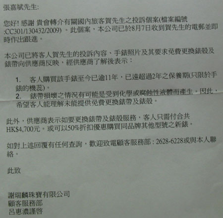 2.表帶損壞之情況有可能是受到化學或腐蝕性液體而產生。(注:我長期在辦公室工作,除了人體汗液,根本不可能接觸‘化學或腐蝕性液體’,謝瑞麟珠寶公司在復函中只講表帶,只字不提表殼銹蝕腐爛的問題)。