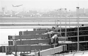 上海世界上最大的綜合交通樞紐顯露雛形。圖為虹橋機場西航站樓登機引橋和相關配套設備已基本安裝完畢。新華社記者