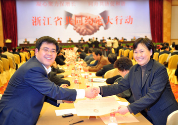 3月19日,來自浙江各地的119家知名國有與民營企業(yè)與本企業(yè)的職工方代表在杭州簽署“共同約定書”,承諾企業(yè)與職工攜手抵御國際金融危機(jī)給企業(yè)和職工帶來的沖擊,展現(xiàn)企業(yè)與職工利益共同體的形象。“共同約定書”中企業(yè)承諾自覺承擔(dān)社會(huì)責(zé)任,穩(wěn)定就業(yè)崗位,保障職工合法權(quán)益,在經(jīng)營困難期間,做到不裁員或少裁員;職工方承諾與企業(yè)同舟共濟(jì),共渡難關(guān)。遇到問題通過工會(huì)和職工代表大會(huì)等途徑合法解決。本次簽署“共同約定書”的企業(yè)共119家,涉及職工10萬多人。圖為中國電信杭州分公司的企業(yè)方代表(左)和職工方代表(右)在簽署“共同約定書”后握手。
