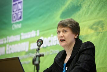 12月15日,在丹麥首都哥本哈根,聯(lián)合國發(fā)展計劃署署長海倫·克拉克在“中國低碳經(jīng)濟與社會發(fā)展之路”高層研討會上致辭。據(jù)這次研討會透露,中國將在2010年發(fā)布關(guān)于低碳經(jīng)濟和可持續(xù)未來社會的《國家人類發(fā)展報告》。該報告將依據(jù)一套切實可行的政策選擇,陳述中國低碳經(jīng)濟和中國社會道路的政策平臺,同時也將社會發(fā)展納入考慮。新華社記者