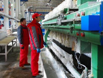 2009年12月26日,青海中信國安科技發展有限公司本年度第5000噸碳酸鋰下線。這標志著青海省“鹽湖提鋰”已進入工業化階段,國外碳酸鋰巨頭對中國市場的壟斷宣告結束。 圖為青海中信國安科技發展有限公司兩名工人在觀察設備運轉。新華社記者 吳光于