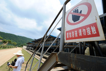7月13日,紫金礦業銅礦濕法廠一處污水處理裝置掛著警示牌。 當日,由于污水滲漏事故造成福建汀江流域污染的紫金礦業集團股份有限公司向媒體通報了事件處理情況。紫金礦業集團有限公司總裁羅映南接受記者采訪時說,“肇事”的銅礦濕法廠已經無限期停產,全面開展整改,同時將依照事故調查結論承擔事故責任和經濟賠償。新華社記者