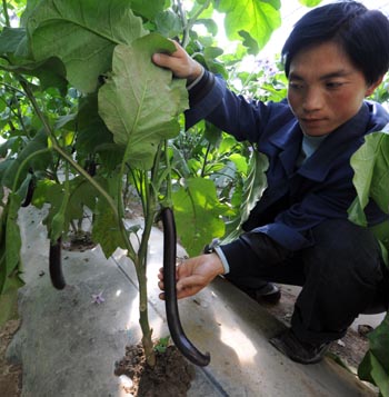 中國西部航天育種基地培育的航天蔬菜。技術(shù)人員丁耀宏展示正在進(jìn)行選育的一種航天茄子。新華社記者 韓傳號(hào)