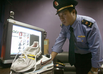 北京市工商人員查獲利用互聯網出售假冒耐克運動用品的個體戶。 |