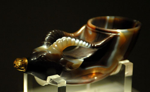 日前,《大唐遺寶——何家村窖藏出土文物展》在陜西歷史博物館開展。這次展覽匯聚陜西歷史博物館收藏的何家村窖藏出土文物300余件,是何家村窖藏出土文物出土以來首次大規模集中展示。“西安何家村窖藏”,因1970年出土于西安市何家村而得名。其出土文物因數量眾多、種類繁復、工藝精美、保存完好著稱于世,被譽為二十世紀隋唐考古最為重要的考古發現之一。圖為正在展出的鑲金獸首瑪瑙杯。