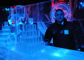 這家冰雕博物館用從瑞典運來的70噸冰雕成34種晶瑩透體的景物,其中有北歐老人、手提籃子的婦人、北極熊、小鳥、馴鹿,還有船只、酒吧、小橋、會議室等。里面還用土耳其生產的100噸冰作為冰的圍墻。