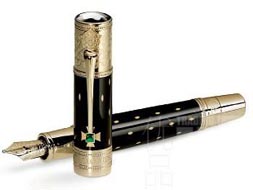 藝術(shù)贊助人“伊麗莎白一世”為888系列K金墨水筆配以名貴的焗漆筆桿及筆帽,18K金筆嘴刻有皇冠圖案,象征女皇1559年登基時(shí)佩戴的冠冕;筆帽頂鑲珍珠貝母萬寶龍六角白星標(biāo)志,飾以都鐸王朝玫瑰K金徽章;筆夾則鑲有一顆方形綠色石榴石,與女皇皇冠的珠寶飾呼應(yīng);而女皇年輕時(shí)自制《The