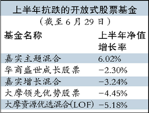 今年上半年,在滬深股市跌幅約達26.8%的市況下,偏股基金也是一片慘綠。 其中,被動跟蹤指數投資的指數型基金損失最為慘重。根據銀河證券研究所數據,截至今年6月29日,標準指數型基金上半年凈值平均下跌了25.58%,增強指數型基金期間凈值平均跌幅25.54%。 而各類主動型偏股基金均大幅跑贏大盤,平均凈值跌幅約在14%~18%之間。不過,僅有嘉實主題精選取得正收益。截至6月29日,該基金凈值逆勢增長6.02%,排名僅居其后的華商盛世成長、嘉實增長混合今年以來凈值也均有所虧損。