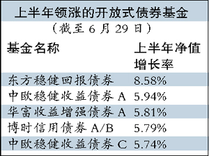 上半年市場昨日正式收官,2008年的一幕再現,偏股基金近乎全線盡墨,債券基金卻是滿園春色。上半年,具可比數據的開放式基金中,近八成債券基金取得正收益,卻或僅有一只股票基金獲得正收益。債券基金東方穩健回報以近9%的收益率勇奪開放式基金收益冠軍。