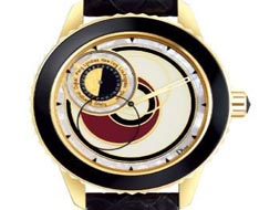 Horaires”機芯,同時顯示8座城市時間。在具有衛(wèi)星效果的幾何和移動轉(zhuǎn)盤設(shè)計中,黑色環(huán)形秒針每分鐘在表盤上旋轉(zhuǎn)一周,衛(wèi)星轉(zhuǎn)盤每12小時旋轉(zhuǎn)一周,而標有8個時區(qū)的衛(wèi)星環(huán)則每24小時自轉(zhuǎn)一周。衛(wèi)星中時針指示方向為自我設(shè)定的當(dāng)?shù)貢r間,其余各時區(qū)時間則依靠城市下方與圓點對應(yīng)的數(shù)字呈現(xiàn)。各種環(huán)形與色彩充滿表盤,如果不了解閱讀規(guī)則,它一定也是帶有謎一樣身份的完美配飾。